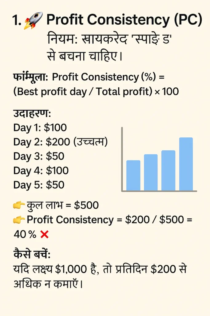👉 Profit Consistency = 200 / 500 = 40% ❌ (Limit < 20%)
